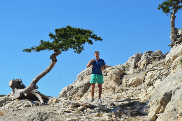 We started the climb up the stone steps that twisted as it turned up toward the top. I wore flip-flops up here, and trust me, it's not a good idea. I tripped many times as it was not a flat surface. Once at the top, the view became even more amazing and there were quirky little things dotted around, like little windows and bendy trees. There were three churches on top of the hill, one new one, an old one and an even older one—all a similar shape. The older ones are very close to the edge, but they look amazing once you step foot in them.