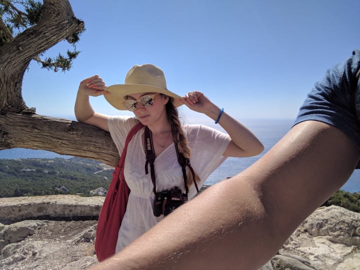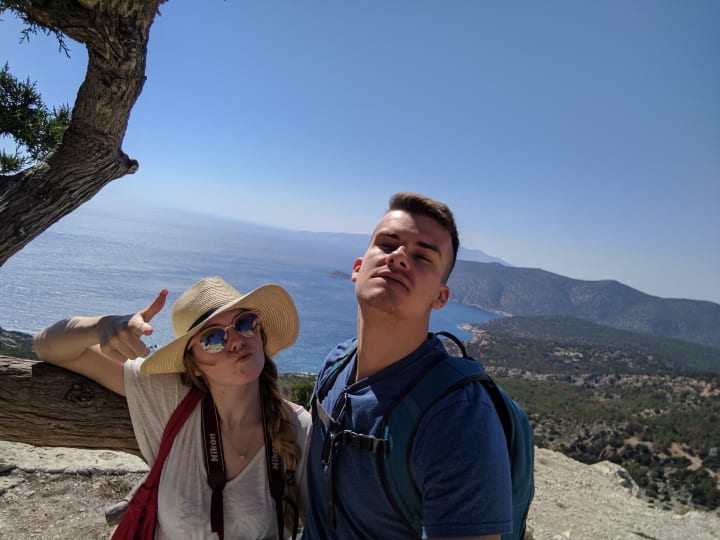 Day three was the day I was looking forward to the most. On this day we got up nice and early and headed to the place where the seas meet at the south-westerly point of the island. My expectations of this destination were very high; I had been telling Tom about it for weeks non-stop. I loved this place when I went to Rhodes with my family. Although, when I got there, I was a bit upset by how much litter there was. We parked up on a hill just before reaching the sea.