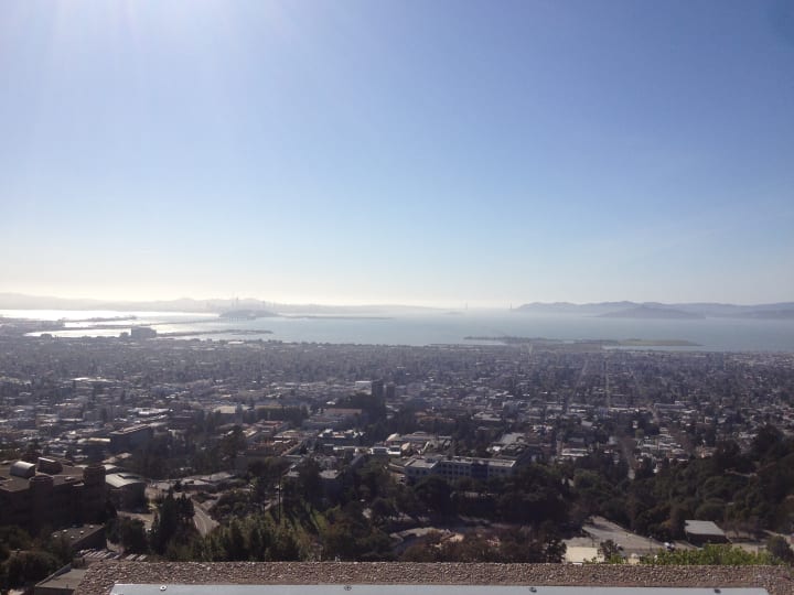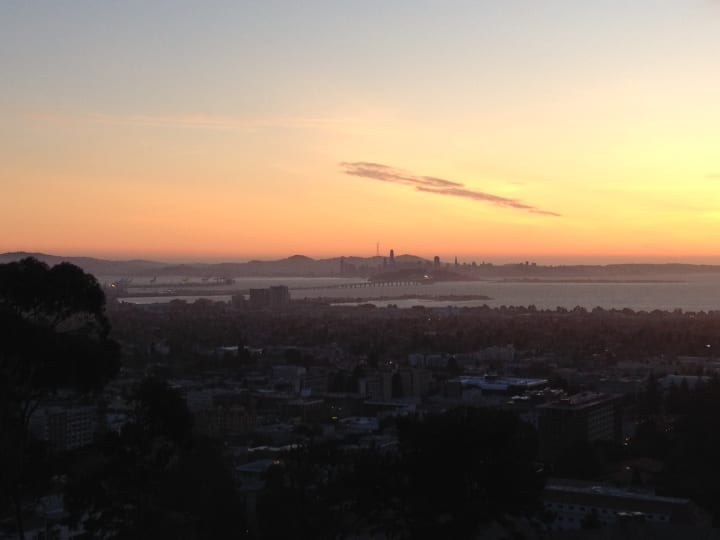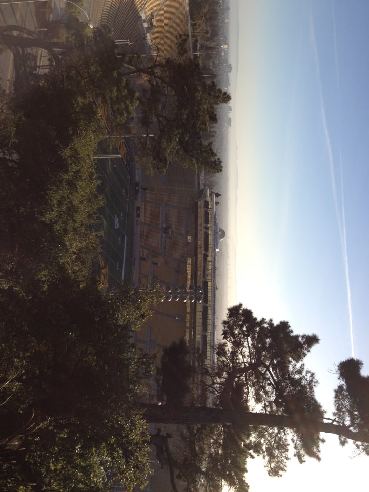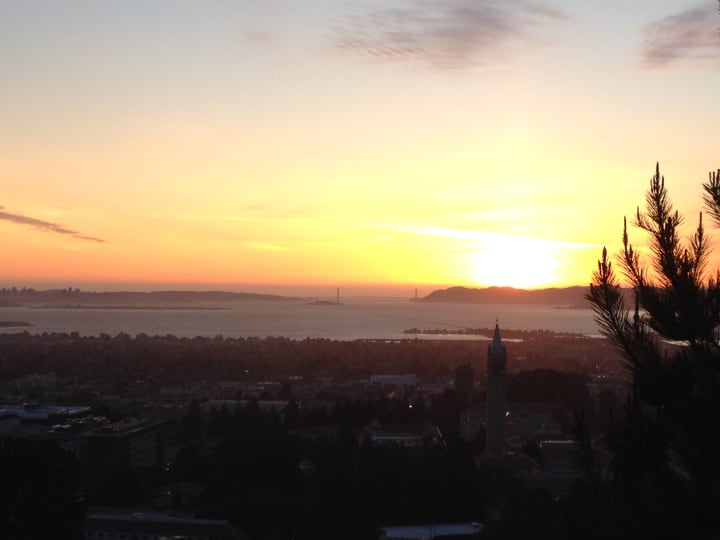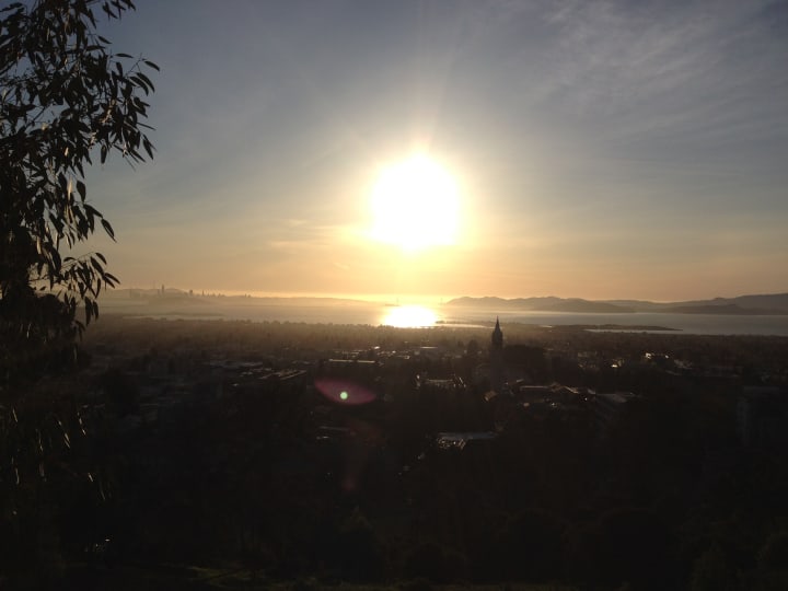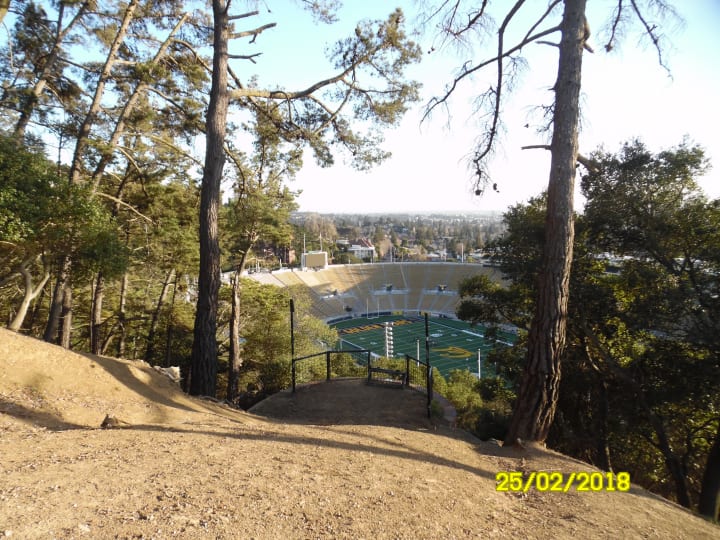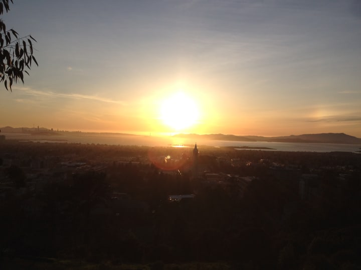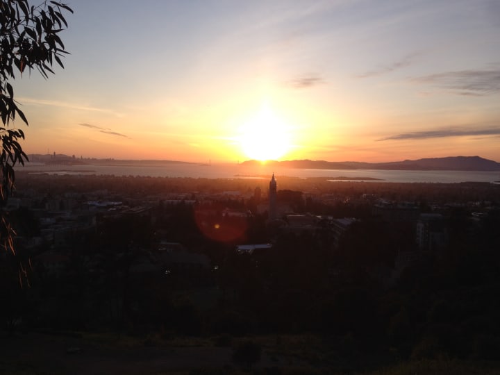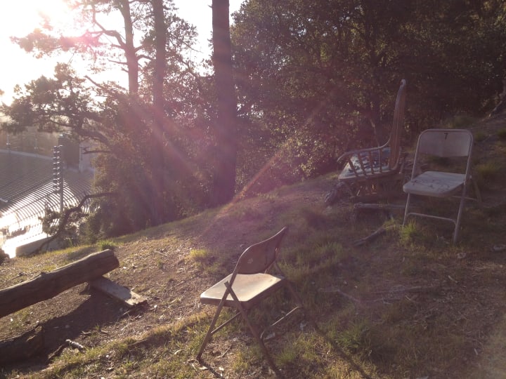 Tightwad hill is called such because of its view into the California Memorial stadium — you can watch games from the hill without buying a ticket. There's some old chairs, and tree stumps and logs from fallen trees used as seating. Sitting on a tree stump, I listen to the song "Tightwad Hill," and realise that the members of Green Day were my age when the song was released. I decided to watch the sunset there, before finding a way back down. The views didn't just take in the stadium, but also across the bay.