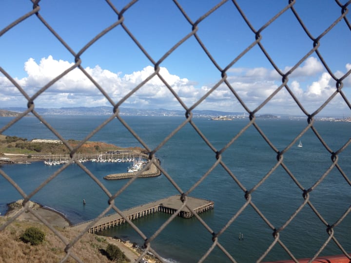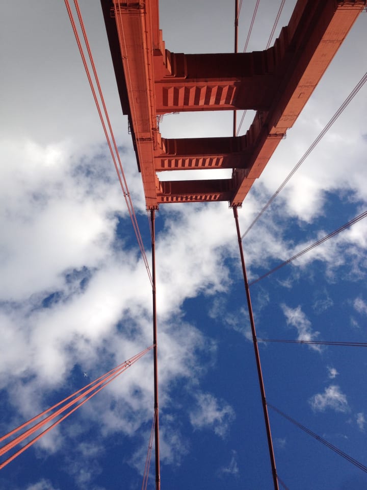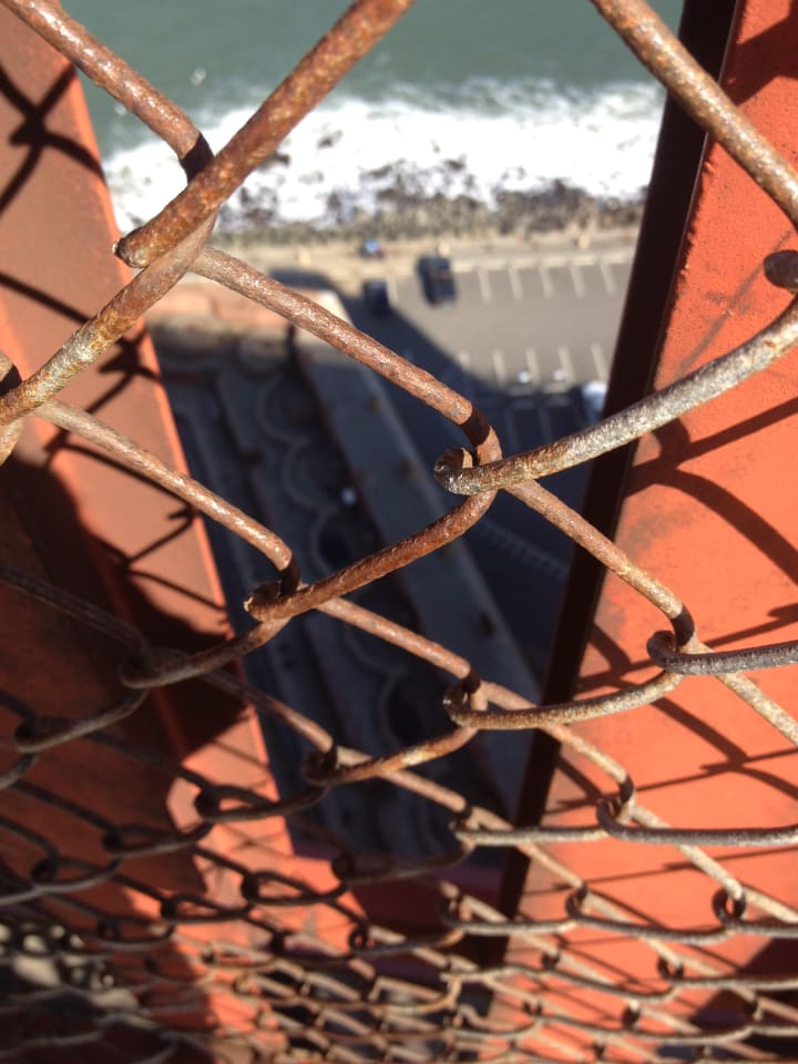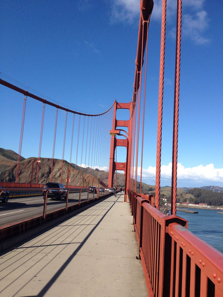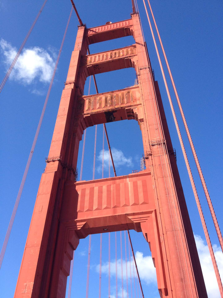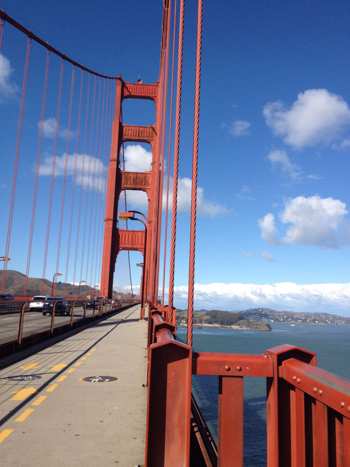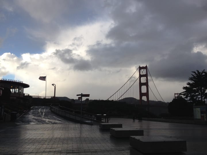 It wasn't until I was about a third of the way across the bridge that I remembered that it was a suicide hotspot, making the rest of the journey tough for me. I was glad when I made it to the other side, in Marin county. But seemingly the only way back to San Francisco was to walk back across the bridge. In a living example of pathetic fallacy, the skies clouded over on the Marin county side, and as I reached San Francisco, the clouds followed me, showing off with a brief shower of hailstones.