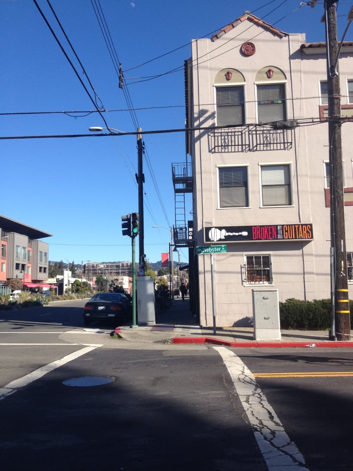 Having spent too much in the Emeryville Target, I walked along 40th Street to the point past Telegraph Avenue with Broken Guitars, and across the road, 1-2-3-4 Go! records. Broken Guitars is a guitar shop owned by Billie Joe Armstrong and (guitar tech, tour crew manager, and Pinhead Gunpowder member) Bill Schneider. I don't go in, feeling my lack of knowledge of guitars will be too obvious.