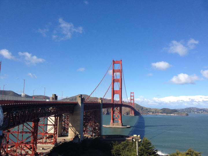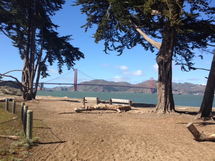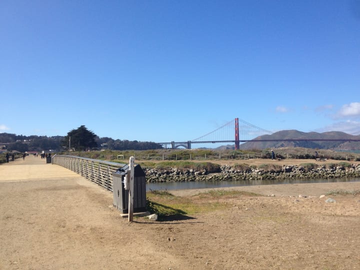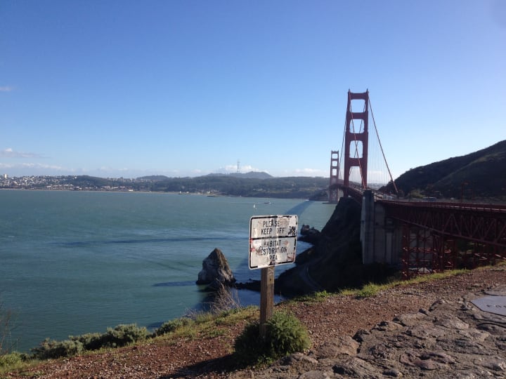 While trying to work out where a bus stop is, I instead decide that the 45 minute walk along the beach and up to the Golden Gate bridge isn't so bad. By this point in my adventure, I have a cold and am sneezing frequently. So I walk along by Crissy Field, then up the hill to the welcome centre.
