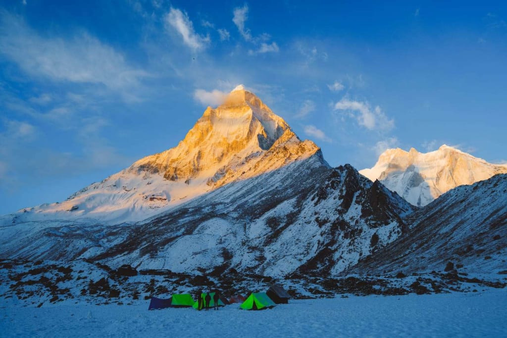 Tapovan sits at an altitude of approximately 4,463 meters (14,640 feet), making altitude sickness a potential concern.