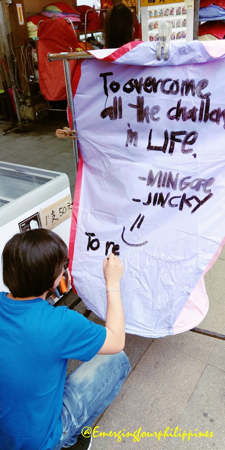At the point when we landed in the spot (11:30 am to 1:30 pm), it is pretty drizzly; we search for a store to purchase an umbrella. Fortunately, there is an elderly person selling umbrella for一百yībǎi (100).