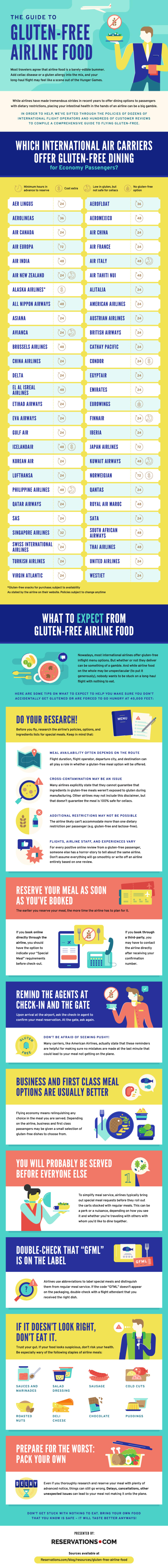 At the end of the day, it’s just plain difficult to place full trust in and rely on the busy airlines staff to accommodate your needs. Reservations.com affirms the best tip for gluten-free travelers is to do your own research and come prepared with your own snacks and meals.