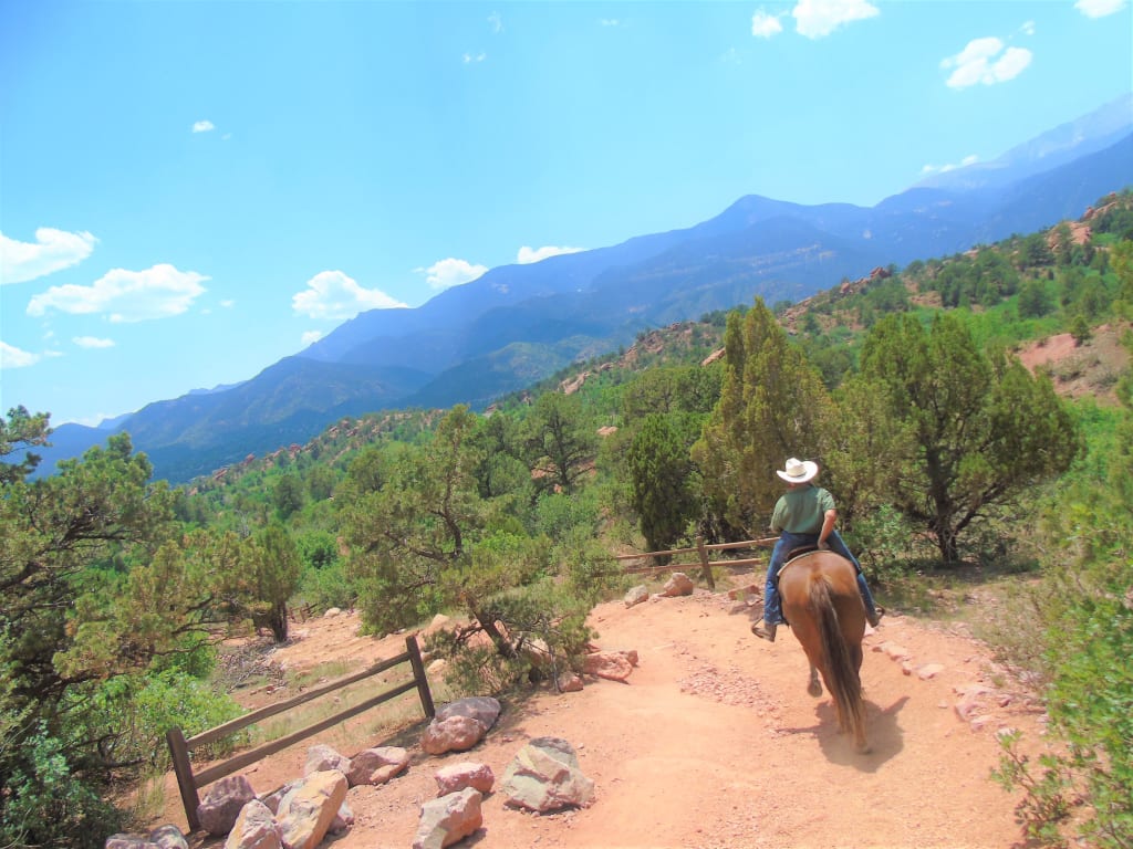 Let me take you on a journey through the lens of Tia Jones. I have created a submission that I recently enjoyed, it consists of hiking, horseback riding, and sight-seeing all in one. This image is a visual of Colorado Springs beautiful mountains, our friendly horses at Academy Riding Stables, and the amazing sight of rocks with many different forms and names. This memory was a date day that my husband had surprised me with, I had to choose this photo because it captures so many details and tells a million stories. This photo had now created a new memory to me and my husband's photo gallery, I could never forget this day. I don't have an explanation of how I edit the photo, I just took it and posted it here. I want everyone to enjoy the beauty in this image and share the same feelings I had while taking it. The trip began when we mounted the horses and I felt a sense of security and excitement. We began to head towards the trail, so many cars passed by us on the road waving and smiling at the sight. We approached the trail and as we entered the park, everything seemed so surreal, the mountains looked like green screen literally straight out of a movie, the rocks were forming objects you could never un-see no matter how hard you tried, one of the rocks formed a giant laid on a rock looking up at the sky, another rock formed two camels kissing which is known as The Kissing Camels history says its recorded as the longest kiss in history. As we continue through the trail we learned how you were supposed to lean going uphill or downhill in order to not hurt the horses back, going down you pointed your toes up heels down and slightly leaned forward and uphill you pointed your toes up heels down and slightly leaned back. This info makes me respect horses that much more, they put themselves in a position to be our transportation no matter the condition and that's a true sacrifice. I enjoyed the sunshine on this day and most importantly the group that I was on the trail with. The trainer was so intrigued with Colorado she couldn't stop saying how amazing the atmosphere was compared to Minnesota, she also asked us a lot of questions and seem interested in who we were and where we came from. My image is originally from Colorado Springs, I grew up here and when I say there's no place like home, I mean it no other place I've been compares to home. I would recommend anyone who comes to visit to stop by Academy Riding Stables and take a tour to see what Garden of the Gods has to offer and you'll never forget this place. The clouds this day were as white as snow so perfect and the sky was as clear as crystal lake water. The air was so crisp and clean made you feel as if you were breathing in life with every breath, the horse were so groomed and well behaved they knew exactly where to go every step of the way and we didn't have to pull them away from the bushes if they tried to eat. None of them were stubborn and so friendly and so gentle as if they could read exactly who we were. The dirt was calm didn't have to worry about dust blowing around getting in our eyes and helped the horses along the very path that took us through the trail. The trees were green some tall some short, the looked like they swayed back and forth as we passed by each one, they smelled so fresh and seemed to make you at one with nature. You could hear how the silence called you name telling you that everything was fine and you were safe here, it embraced you with a warm hug from the sun and a sense of security from the horses, trees, and rocks. I shared this beautiful moment with someone I truly care for and love and this memory plays like a recording I never want to turn off, he opened up and showed me a new side of him that makes me proud to see he isn't afraid to try new things with me. I opened my heart and eyes to a whole new world this day, it showed me that the simple things can really make a huge difference in your life and others, you perceive life the way you want to and it can be beautiful or ugly. I share my love for photos so that you can wear my eyes for a chance and get a feel of the goosebumps and heartfelt moment I felt on this very day at this exact moment.