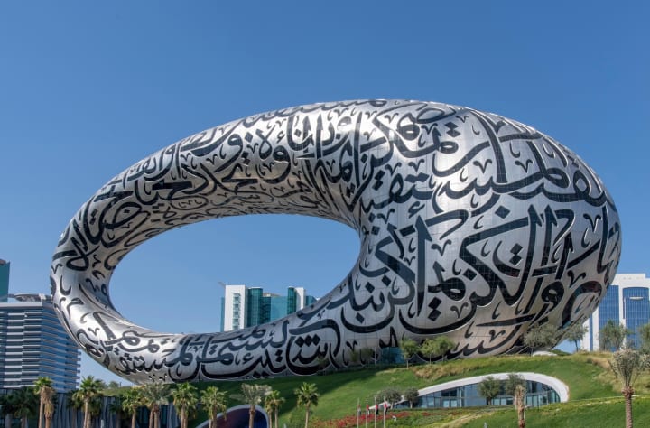 Even the building itself, a gleaming silver torus covered in Arabic calligraphy, is a work of art. Inside is not a collection of old artifacts, but a vision of the future.