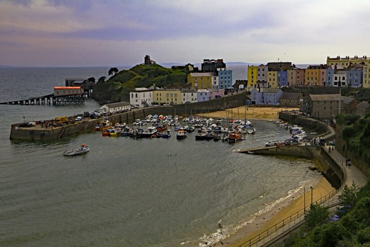 Moving east, we travel to Tenby, where we find a picturesque harbour and beach. Tenby Harbour sits in a central position in this beautiful, Georgian town, often known as "The Jewel in Pembrokeshire's crown." It is located on the western side of Carmarthen Bay. To the south of the harbour we can see the old and the new lifeboat stations,