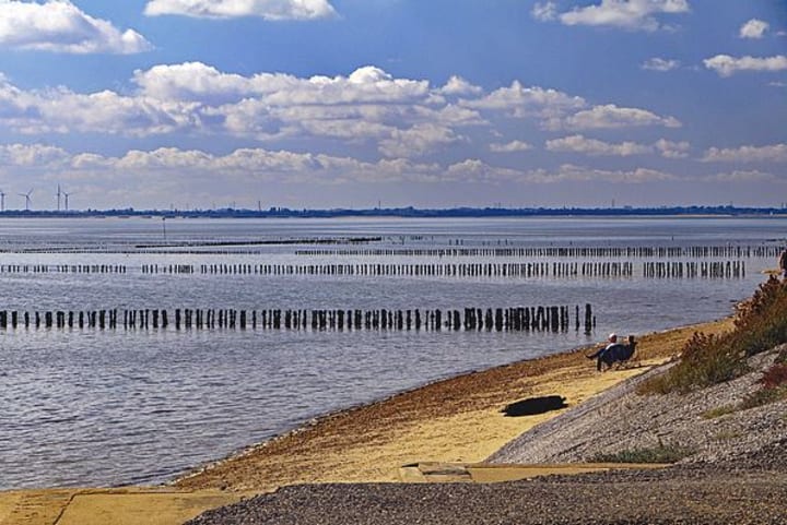 Moving over the border into Essex, we travel to Mersea Island, which is Britain's most easterly inhabited island. The island is split into two main areas, West Mersea and East Mersea, and connected to the mainland by the Strood, a causeway that can flood at high tide. Here we see East Mersea Beach with the groynes stretching out to sea.
