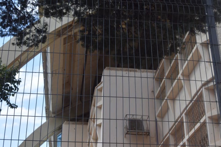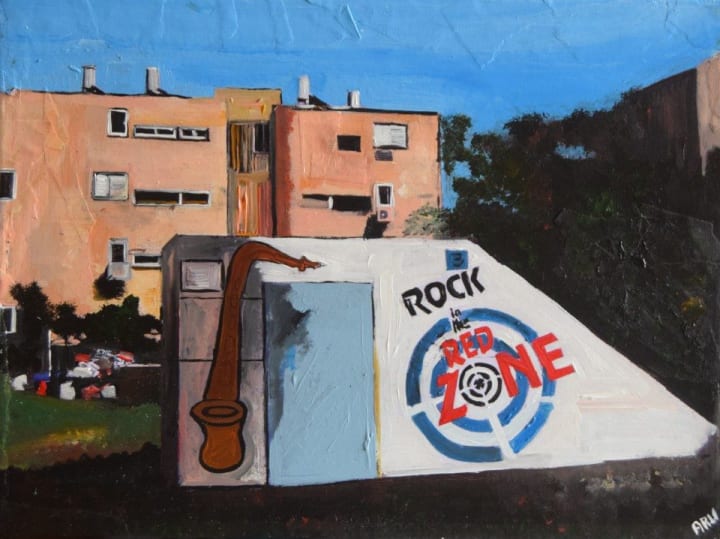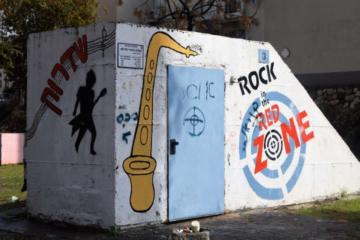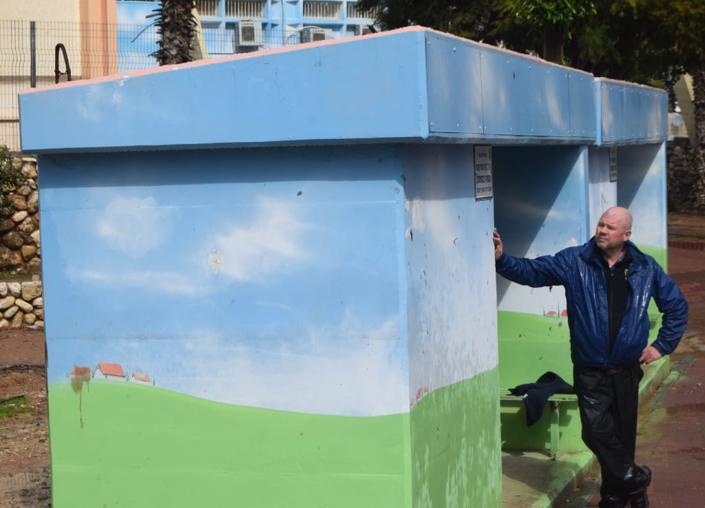 The station felt normal, as though one were in suburban Spain, and beyond was the boulevard of palm trees and spongey lawns that led into town. A shopping arcade sat to my right. Luckily, the rain held off and I walked. Houses of red roofs and white walls, small gardens—normal apart from the regularly paced bus stops that doubled as shelters, with concrete blast walls. I closed my eyes and tried to imagine how I would feel and what I would do if the alarms started, that hideous jingle of whooping and of disembodied voice shouting "Tzeva Adom, Tzeva Adom," or "Code Red." But it was quiet, just the rustle of wind in the palms. I soon reached the centre of town. I noticed it, the damage; a ruined awning, burned out and flapping, a small arcade of shops, chipped concrete, a drum-like siren on the roof of a bank.