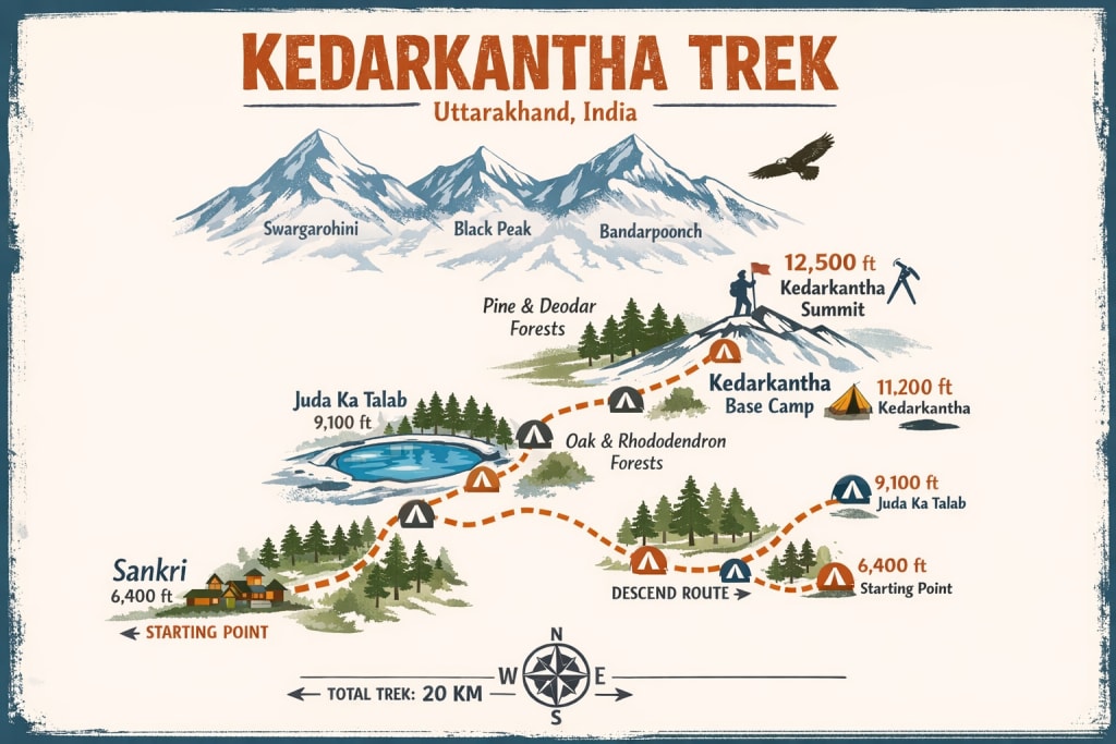 This guide on Kedarkantha trek route map clearly outlines step by step journey, explains how the trail flows on the ground, and helps you mentally visualize the journey even before you set foot in Sankri.