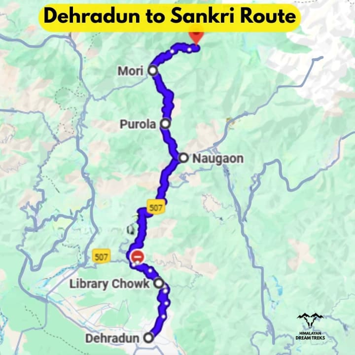 - Dehradun → Mussoorie → Naugaon → Purola → Mori → Sankri (by road)