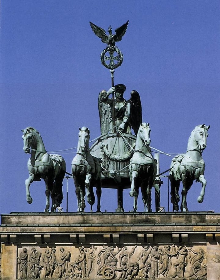 At the top of the monument, is a sculpture of the Quadriga, a chariot pulled by four horses driven by Victoria, the winged goddess of Victory.