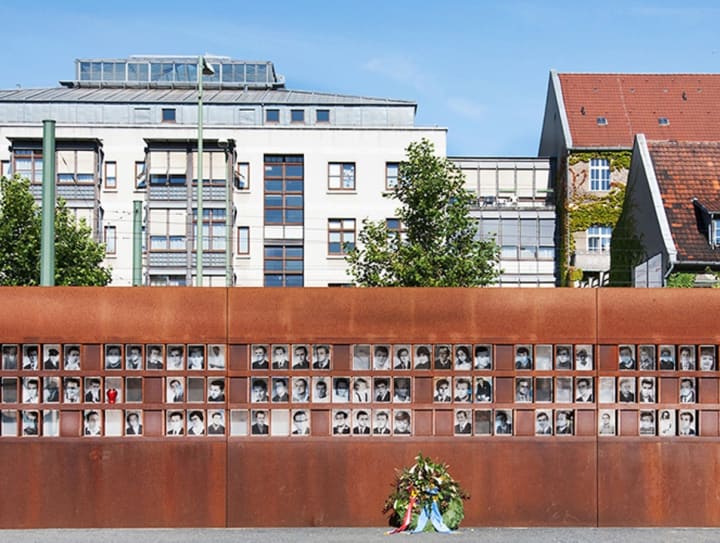 There are graffitied segments of the Berlin Wall that once separated the socialist, former East Berlin from democratic West Berlin. The Berlin Wall Memorial is one of the few monuments to the Cold War and has 101 panels painted by artists in 1990 to commemorate the fall of the wall preserving a segment from destruction by urban development.