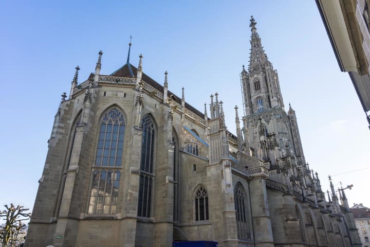 Berner Munster or the Bern Cathedral or the Cathedral Of St. Vincent is Switzerland's largest church dating back to the late Middle Ages. It was built in the Gothic style the church has a three-aisled basilica with an octagonal upper section and openwork spire. The west doorway is decorated with sculptures with a number of figures and on the side walls are paintings of the Fall and the Annunciation.