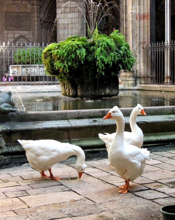 Visitors enjoy the cathedral's cloister and garden shelter where 13 live geese symbolize the martyrdom of Saint Eulalia.