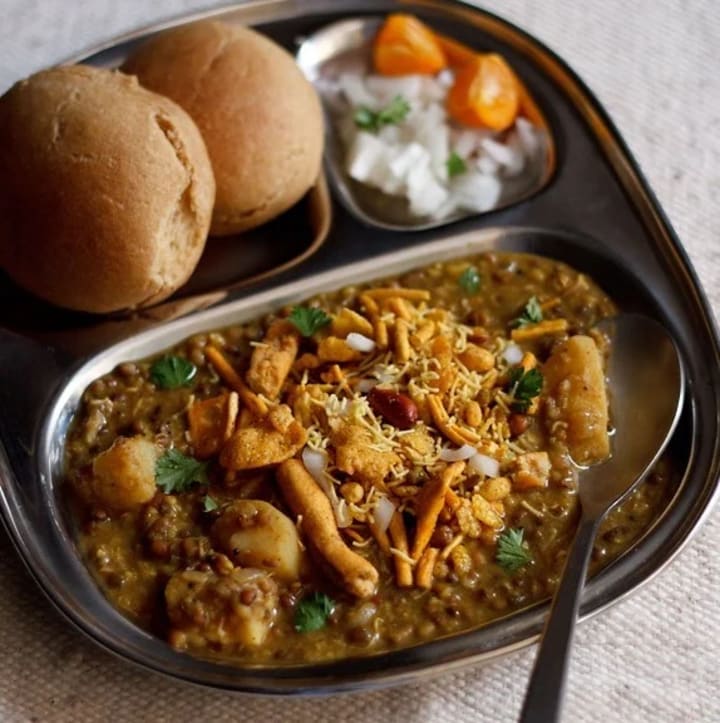 Misal Pav - Misal Pav is a spicy Maharashtrian dish that consists of sprouted moth beans cooked with a flavorful blend of spices and served with bread (pav). It is usually topped with farsan (crispy fried snacks) and chopped onions and coriander.