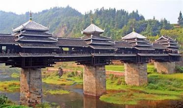 The Chengyang Bridge in Sanjiang County is a wooden bridge with two platforms and a roof covered with tiles. The bridge also has a corridor and veranda. Built in 1912, it serves as the link between two villages.