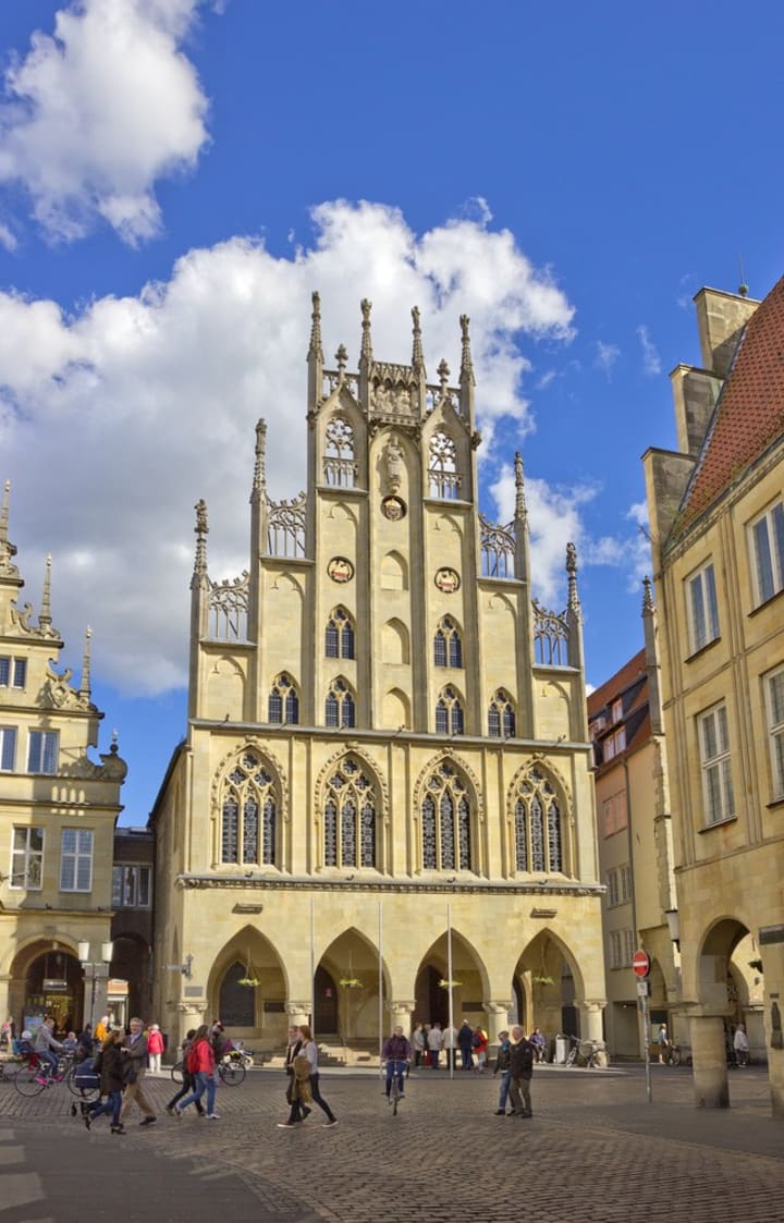 A Munster landmark is the Rathaus or City Hall. This is a Gothic building with a high gable that dates back to the mid-14th century. The original building was destroyed during the war and rebuilt as a near-replica of the original. The most important room here is the Friedenssall or Hall of Peace, where the Spanish-Dutch peace treaty was signed on May 15, 1648, and the Thirty Years War ended with the peace of Westphalia on October 24, 1648. In 2015 the European Commission honored the historical Town Hall of Munster with the European Heritage Label for being the “site of the Westphalian Peace” – a landmark of European history. The historical importance of the treaty is considered to be the beginning of the international system of laws.