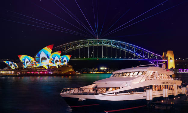 Tens of thousands of Australians traverse across the nation to the harbourcity to enjoy a truly breathtaking night in the midst of Vivid lights, music and creativity. The harbour as usual takes the centre stage with electrifying shows, light installations and more. A Sydney Vivid Cruise is your gateway to experiencing these harbour spectacles like never before from the waters! Choose from numerous top cruises including the classic paddlewheeler, a modern catamaran and a luxury glass boat and witness the Vivid lights from a unique perspective along with a delectable menu of food and upgrades. One of the main drawcards of Vivid Sydney will be the luminous installations on the sails of the iconic Opera House and the bridge coming to life with brilliant light installations. All these displays along with other spectacles can be witnessed from a Vivid Dinner Cruise and the best part is that you can relish everything with freshly prepared dishes and sparkling drinks!