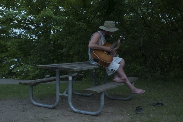 There was a long wooden picnic table with benches on both sides. A guy with a fishing hat sat on the table and was playing guitar. He was wearing a sleeveless shirt and had a cigarette at the corner of his lips. He was singing along with his music. I took a couple of pictures of him, I didn’t want to interrupt him by asking for permission, I didn’t want to go too close where the click-clack noise of my shutter overpowers the melody of his guitar. I stood, distant enough but at his sight to take a picture. He glanced at me, smiled, looked away, and kept playing.