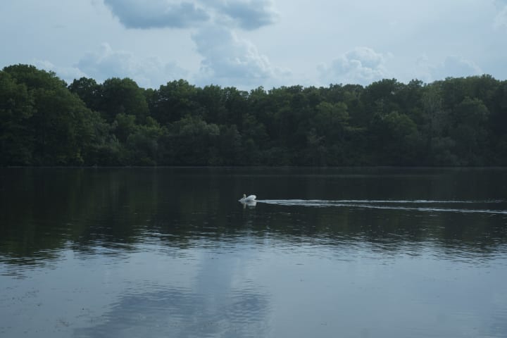 There was a swan swimming freely on the lake. In the distance, was another swan with chicks. I thought the one with the chicks was the mother and the other swan must be the dad.