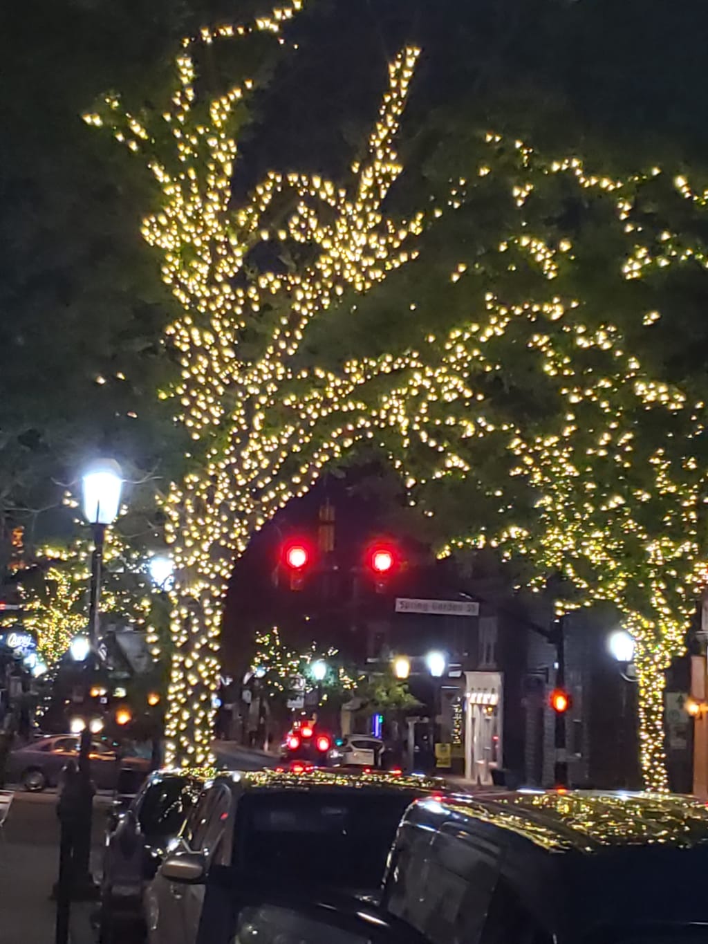 Just down the main street, Butler Avenue, you see two coffee shops plus other places that sell coffee, ice cream parlors, Gelato bars, Indian Mexican food restaurants, and even large Yoga studios, dance classes, hardware stores, and pizza shops. On week nights the trees are lit up in a girdle of bright, white lights, along the main street that gives adds to the festive atmosphere. Crowds of people mill around traveling to various places. The crowds are not overwhelming and hard to navigate.