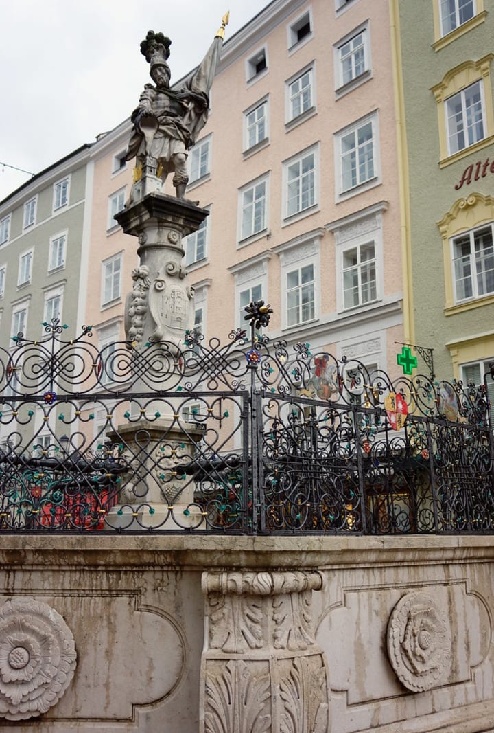 The Kranzlmarkt is located at the eastern end of Getreidegasse. Here you'll find the Old City Hall. In the Old Market is the Court Pharmacy from the 13th century and in the middle of the square you'll find St. Florian's Fountain, which is a landmark known for its unique octagonal basin and spiral grille from 1583.