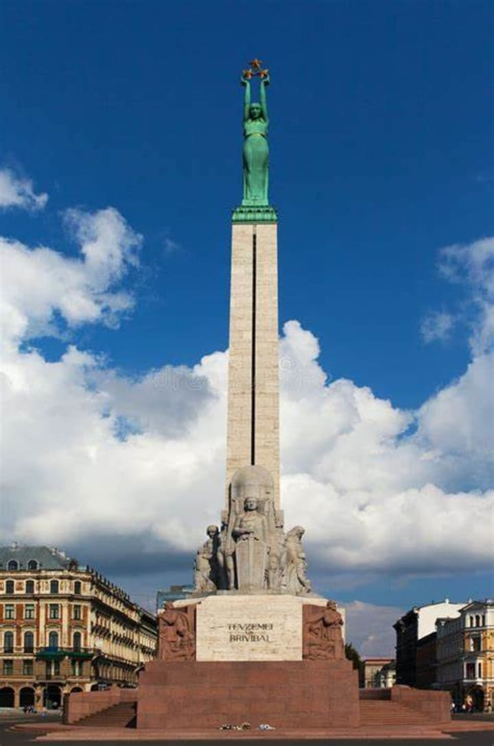 The Freedom Monument is one of the most popular landmarks in Riga. This tall green lady that stands on top is affectionately known as "Milda." She holds three gold stars in her outstretched hands that represent three historical regions of Latvia - Kurzeme, Vidzeme, and Latgale. If you approach the base you’ll find 13 groups of reliefs recording national heroes, allegories, images from Latvian culture, and pivotal moments in the nation’s history like the Russian Revolution of 1905 and the War of Independence. Residents and visitors place flowers at the base of the monument to remember people who were deported to Siberia during Soviet times. There is a changing of the guard each hour. It is built from red granite and travertine. The Freedom Monument remains the centerpiece for official remembrance ceremonies.