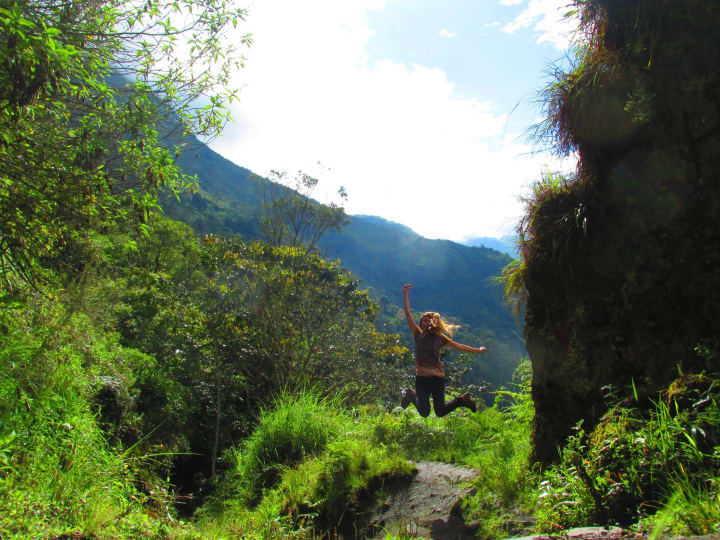 I set off on foot from my bright little hostel with water and a sandwich in my bag, heading for the far edge of town. For the first hour it’s quiet as the clangs and calls of the town fall away, the higher I trek. I hum a bit for company, but stop mid-tune when a clearing in the trees affords me a sudden, unexpected view. From here I can see the whole town, a multi-coloured miniature in the shape of the valley: the very last stop before the jungle, known in the travel guides as “the gateway to the Amazon.” Beyond, there's nothing but green for as far as the eye can see.