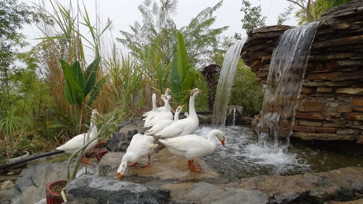 Piplantri's water-harvesting plan has involved trapping water runoff and increasing the groundwater level by building ditches, bunds and dams. Across the village, large posters showing before-and-after pictures testify to Piplantri's transformation: from dry and brown to green and verdant. Now, clear pools shone in the distance. Around a statue erected in honour of Kiran, geese flitted by, drinking water. As rabbits gambolled in a pen, a peacock crossed the road near a building topped with a solar panel.
