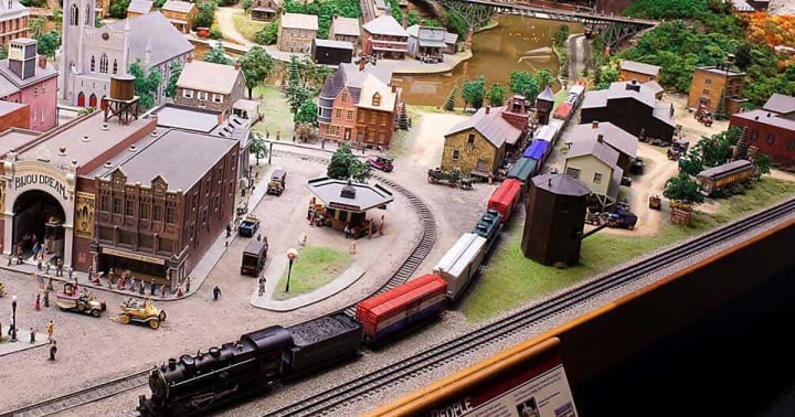 The Miniature Railroad and Village document the history and culture of Pennsylvania with tiny horse-drawn carriages, cars, trucks, trees, and airplanes including animation.