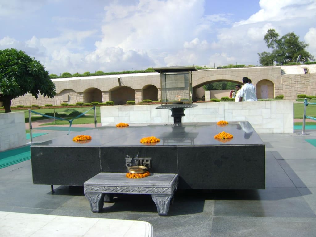 The last words of Gandhiji, "Hey Ram" are inscribed on the black marble and those decorated with yellow marigold