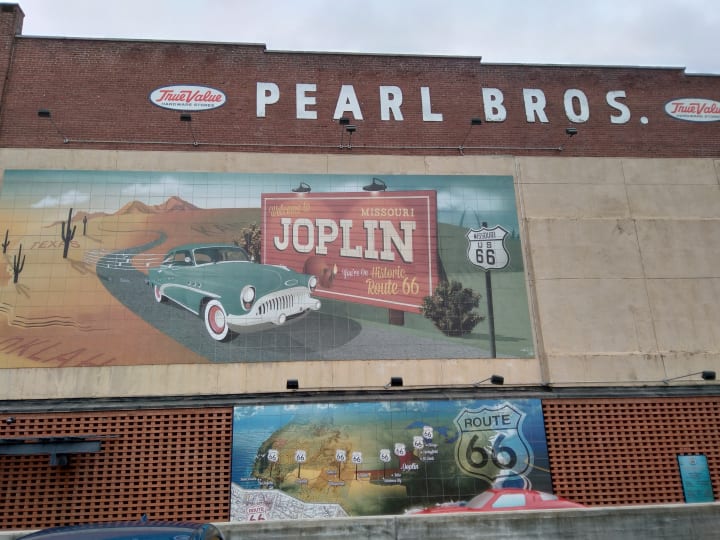 On with the photo essay. I drove west from central Illinois during late May and early June of 2021 to Kingman, Arizona, and then to Las Vegas, Nevada, to start a new job. Later, I made some weekend trips to finish travelling Route 66 from Kingman, AZ, to Santa Monica, California. My first specific Route 66 stop during the drive west was in Joplin, Missouri, to see the murals and sites there.
