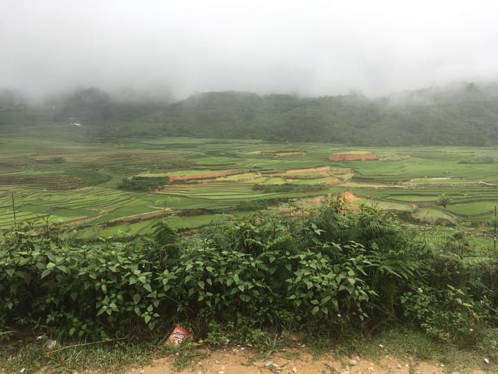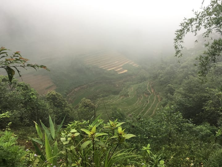 We reached the point where the trekking route begins, a path of just over 3 hours, with a break, through nature. At first it was very foggy because the day was cloudy and we were high up on the mountain. It was a pity because the scenery was so beautiful with the rice fields on the side of the mountain. It's often rainy, so wear a raincoat, and rain will not prevent you from advancing.