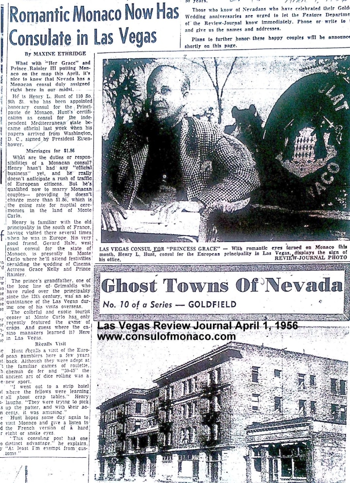 Henry returned to the US in 1940 with his three daughters. He settled in Las Vegas to manage the Hunt land holdings, which soon held the Huntridge Theater and Huntridge community, where Meserve had been the primary investor. Highway 91, where the bulk of the Hunt syndicate's land portfolio lay, became known as the Las Vegas Strip. Their properties would eventually hold all of the major hotels which made the place famous, as well as the Convention Center; the Las Vegas Country Club; and much more. In 1955 Henry Leigh Hunt, virtually unknown in Las Vegas where he was the largest land owner, was appointed Honorary Consul of the Principality of Monaco by Prince Rainier III. He retired to France in 1962, where he lived out his last ten years.