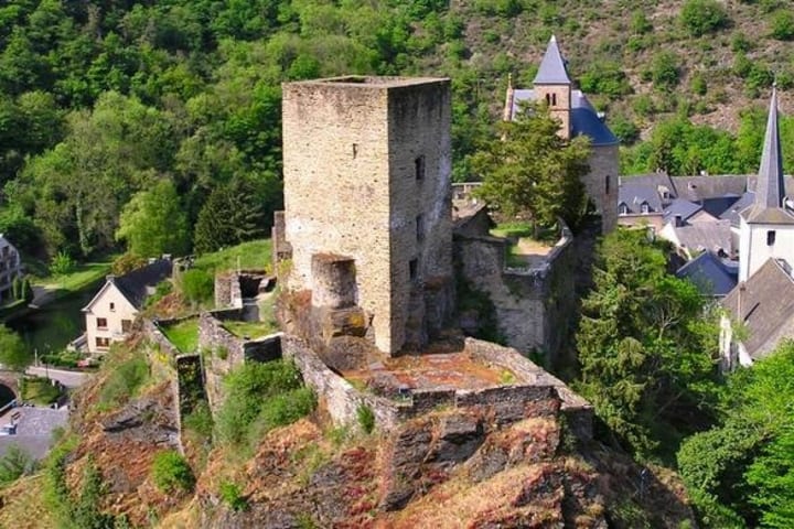 Bourscheid Castle in the village of Bourscheid sits atop a plateau. It is bordered by the Rivers Sure and Wark. This is a lovely fortress dominating the surrounding countryside. It dates from the 10th century. Self-guided audio tours and English-language guided tours are available. In the evenings the castle is lit up.