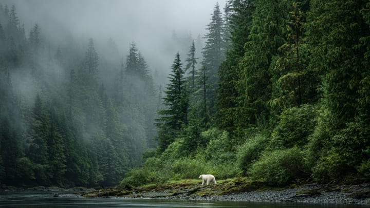 This rainforest is large, misty, and alive. It spreads along the coast of British Columbia. Old trees rise. Glacial rivers run. If lucky, one may see the white Kermode bear, called spirit bear.