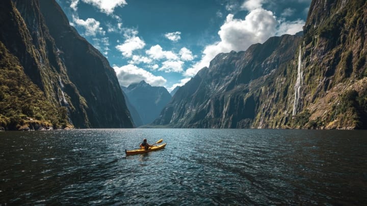 Fiordland is carved by ice. Cliffs fall sharp into dark water. Waterfalls drop from cloud.