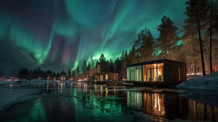 This hotel floats. It is in Lapland, on frozen river. Off-grid. Solar power. Local wood.