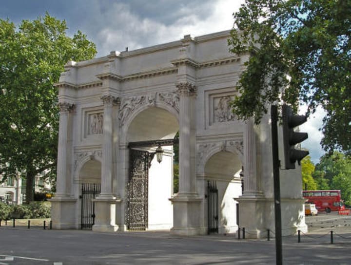 The Marble Arch at the northeast corner of the park was originally a gateway to Buckingham Palace in 1827 and moved to Hyde Park in 1851.