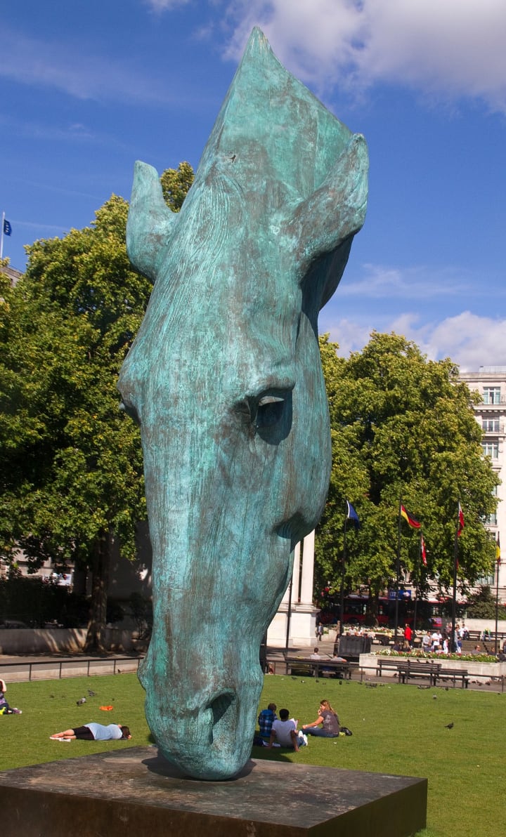 Still Water depicts a huge head of a horse more than ten meters tall created by British sculptor Nic Fiddian-Green.