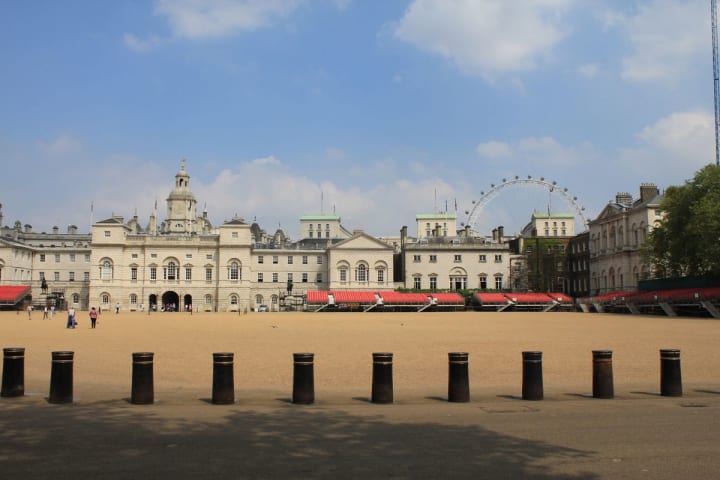 The Horse Guard's Parade and Admiralty House is on the east side of St. James's Park. The Parade is a large open space with one side next to the park and the other entering into Whitehall where two cavalrymen stand at guard.