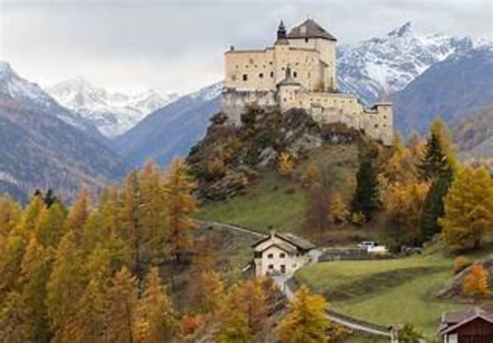 Tarasp Castle is located in the Alpine Upper Engadine. It is a Swiss heritage site. The medieval castle was built in the 11th century. It sits on a hill top overlooking the surrounding landscape.