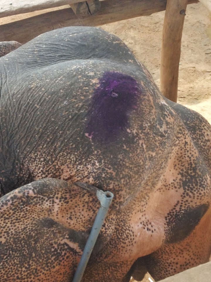 About half way round I noticed that beneath the surface things were even worse. I don't know how I hadn't spotted it before, but on top of our elephants head was a nasty wound. It was a circular indent, the scab still fresh. Around it was a huge purple bruise that covered most of the top of its head. I wondered how it received such an injury but didn't have to wonder for long. Hanging at the driver's hip was a curved blade, similar to an ice pick. Clearly this was how they trained these animals, and I subtly pointed it out to Jane.