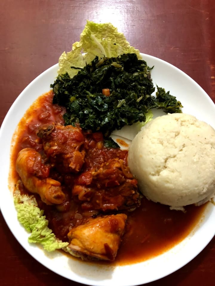 Local food and international food can be found every where you look. This is stewed chicken, kale and ugali. Ugali is made from maize, cooked at a high temperature and stirred quickly. Tastes like grits but cooked until it's firm.