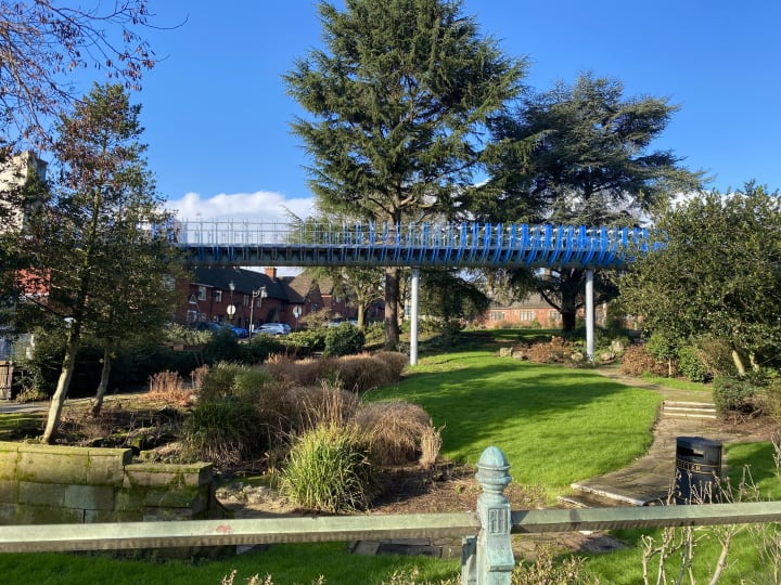 The glass bridge is a spiral ramp that travels over the city wall and Lady Herbert's Garden.