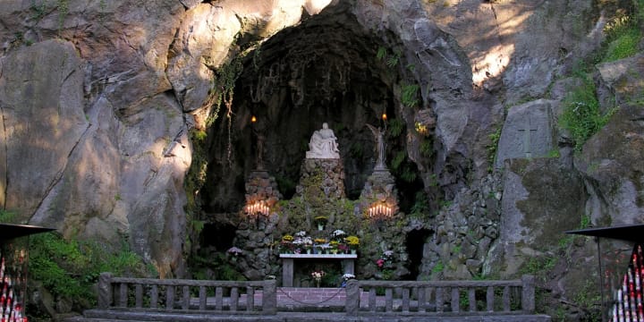 It includes a cave carved out of a basalt cliff serving as an outdoor cathedral. The marble statue in the center of the cave is a replica of Michelangelo’s depiction of Mary cradling Jesus' crucified body surrounded by flowers and votive candles.