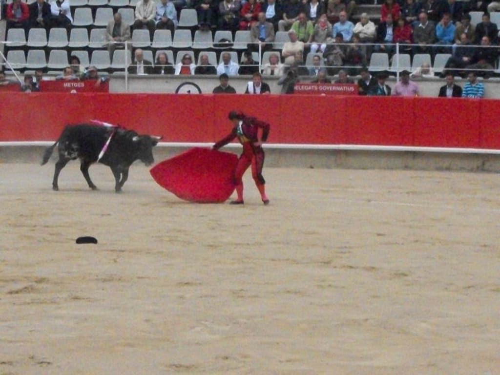 We walked around the coliseum admiring the age and architecture. As we approached the main gate we saw a large gathering and immediately worried if we would be able to purchase tickets or if the event had already sold out. As we walked closer we realized that the vast majority of people standing outside the stadium were protesters holding signs in a foreign language suggesting abhorrent violence and cruelty to animals. We were shocked that something so entrenched in a country’s culture could also be so hated by that same country. We talked among ourselves and decided to go forward with our original plans and pushed lightly by the protesters who were all passionate but peaceful about their cause. If they hurled any insults at us they fell on ears deaf to their language. We purchased our tickets and made our way through the dark tunnels of the interior and out into the sun beating down on a circular structure that looked like it was struck from a gladiator movie set. We sat on the hard concrete and watched as people entered and picked their spots but by the time of the first match the place was hardly a quarter full. We weren’t sure if this was because of the protests or if this event wasn’t deemed a serious or important one. We poured over the program given to us but couldn’t find the specifics among the Spanish writing. We were able to piece together that the day would consist of three different fights and that the second one would be done by a 19 year old woman. We tried to gather more details from locals sitting by us but only one man would speak to us in English and he would only tell us that the previous month one of the matadors was arrested when he cowardly fled the arena during a fight. There was much pride on the line and much seriousness was devoted to the entire affair. When asked about the protesters and cruelty to animals he merely waved his hand and said that many of the bulls were old and would soon be dead and that this was a much grander death for them.