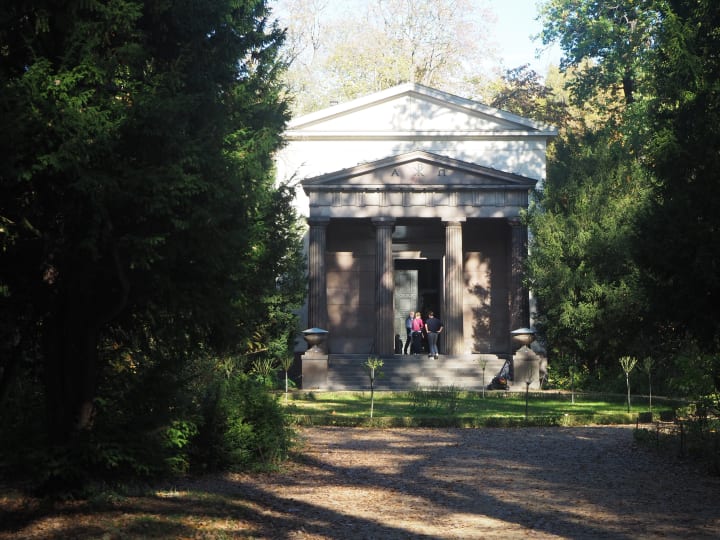 Hidden away in the woods, at the end of an avenue of fir trees, is a small building on the model of a Doric temple. This was built between 1811 and 1814 as the final resting place of Queen Louisa, the wife of King Frederick William III. She died in 1810 at the age of 34. Her funerary monument was sculpted from Carrara marble and is a particularly moving piece of Neoclassical sculpture.